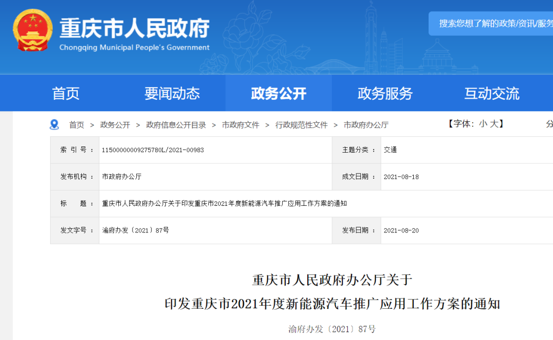 《重慶市2021年度新能源汽車推(tui)廣應用工作方(fang)案》已經市政府(fu)同意,現印發給你們,請認真貫徹執行(xing)。