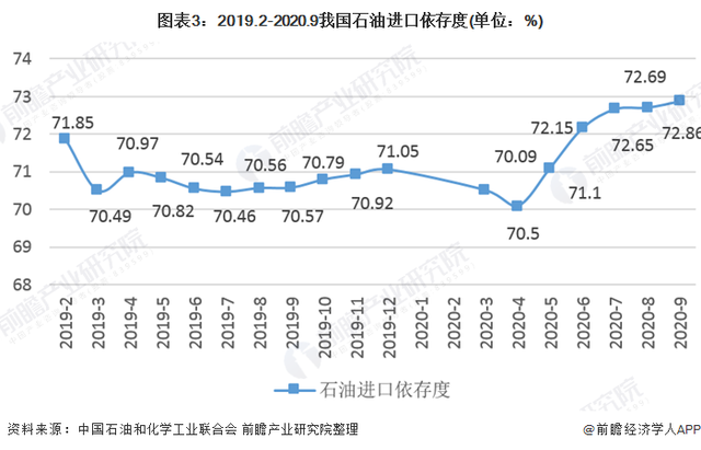 2019年2月到2020年9月,根據中國石油和化學(xue)工業聯(lian)合會公布(bu)的石油進(jin)口依(yi)(yi)存度(du),我國石油進(jin)口依(yi)(yi)存度(du)呈(cheng)上升的態勢(shi)。根據石油經(jing)濟技術研究院發布(bu)的數據,2019年我國原油對外依(yi)(yi)存度(du)突破70%,遠超50%的國際(ji)警(jing)戒線(xian)。