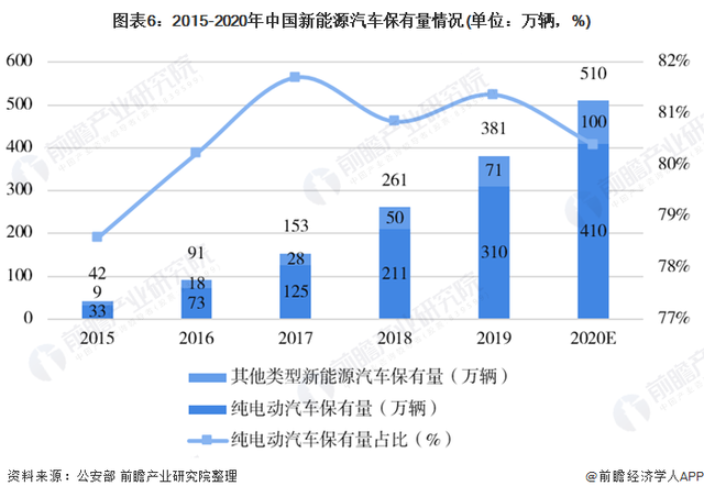 通過近幾年(nian)(nian)的快速發(fa)展,我國(guo)電(dian)(dian)動(dong)(dong)汽車(che)(che)已經從(cong)萌芽期向成長期邁進,在我國(guo)堅持(chi)純電(dian)(dian)驅動(dong)(dong)戰略的推動(dong)(dong)下,我國(guo)純電(dian)(dian)動(dong)(dong)汽車(che)(che)保有(you)量(liang)在電(dian)(dian)動(dong)(dong)汽車(che)(che)中占比(bi)(bi)較大,根(gen)據(ju)公(gong)安(an)部公(gong)布的數據(ju)顯(xian)示,2019年(nian)(nian)我國(guo)新(xin)能(neng)源汽車(che)(che)保有(you)量(liang)為381萬(wan)(wan)輛,其中純電(dian)(dian)動(dong)(dong)汽車(che)(che)保有(you)量(liang)達(da)310萬(wan)(wan)輛,占比(bi)(bi)81.4%,前瞻預計2020年(nian)(nian)我國(guo)新(xin)能(neng)源汽車(che)(che)保有(you)量(liang)將達(da)到510萬(wan)(wan)輛左右,其中純電(dian)(dian)動(dong)(dong)汽車(che)(che)保有(you)量(liang)將達(da)到410萬(wan)(wan)輛左右。