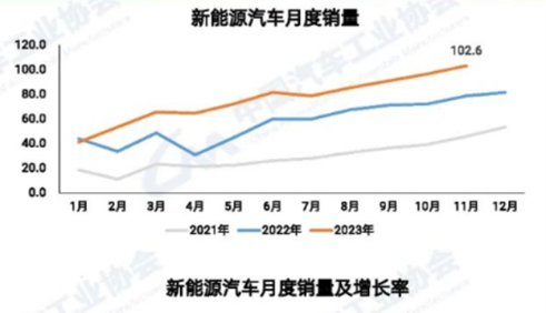 據(ju)中汽(qi)(qi)協數(shu)據(ju)顯(xian)示,2023年(nian)11月(yue),我國汽(qi)(qi)車產量(liang)創歷史新(xin)(xin)(xin)高。汽(qi)(qi)車產銷量(liang)分(fen)別完(wan)成309.3萬(wan)輛和(he)297萬(wan)輛,同比(bi)分(fen)別增長29.4%和(he)27.4%。其中,新(xin)(xin)(xin)能源(yuan)汽(qi)(qi)車月(yue)度產銷量(liang)首次雙(shuang)超百萬(wan)輛,站上(shang)新(xin)(xin)(xin)臺階。11月(yue),新(xin)(xin)(xin)能源(yuan)汽(qi)(qi)車產銷量(liang)分(fen)別完(wan)成107.4萬(wan)輛和(he)102.6萬(wan)輛,同比(bi)分(fen)別增長39.2%和(he)30%。