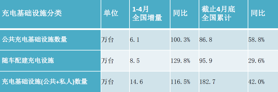 中國電動汽車充電基礎設施促進聯盟5月12日發布了全國充換電基礎設施運行情況,4月比3月公共充電樁增加1.76萬臺,同比增長58.8%。