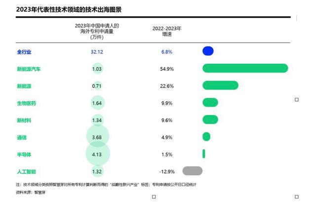 技術出海不斷加速與該領域的研發熱度息息相關。在七大焦點科技領域中,新能源汽車2023年共提交5.19萬件發明專利申請,增速達到21.9%之高。