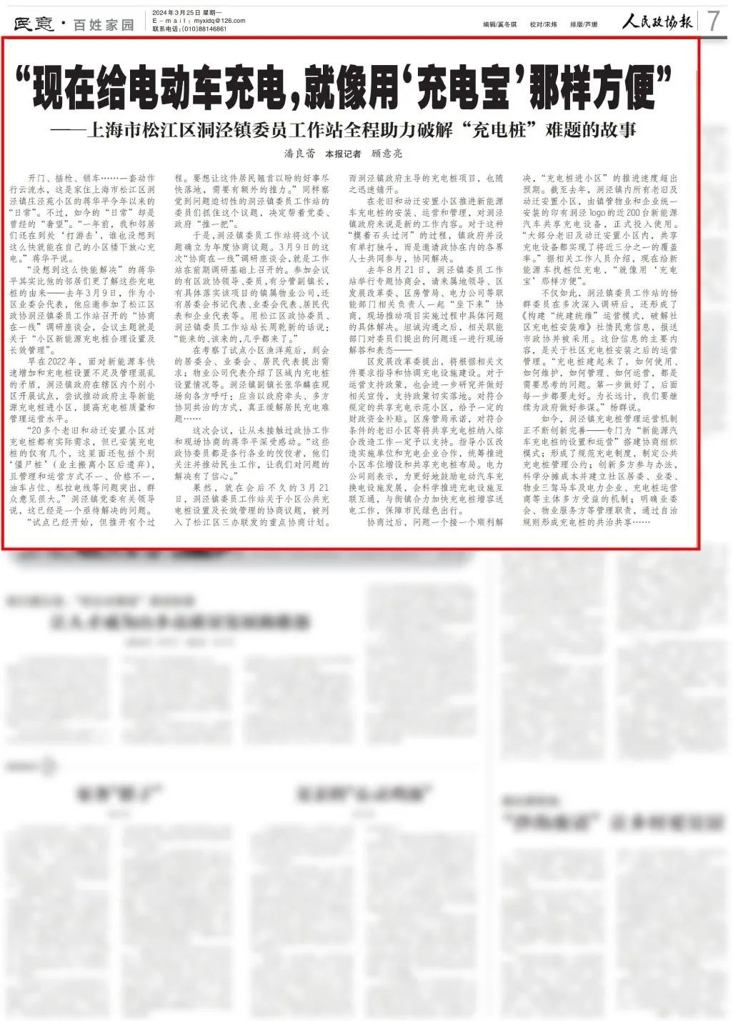 【編者按】3月(yue)25日,《人民政(zheng)協報》以(yi)《“現在給電(dian)動車充電(dian),就像用‘充電(dian)寶’那(nei)樣(yang)方便”》為題(ti),報道松江區洞涇鎮委(wei)員(yuan)工作站聚焦“新能源車充電(dian)難”問題(ti),圍繞充電(dian)樁的(de)合理設置和(he)長效管理等議題(ti)開展(zhan)調研(yan)和(he)協商,助力黨委(wei)政(zheng)府(fu)做好(hao)民生實事的(de)履職事跡(ji)。現將刊(kan)登內容分享如下: