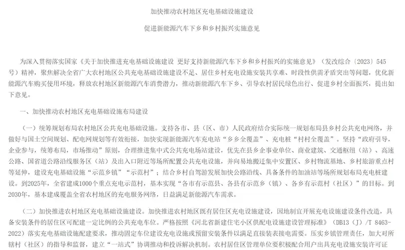 近日,河北省發展和改革委員會發布《加(jia)快推動(dong)農(nong)村(cun)地區(qu)充電基礎設(she)施建設(she)促進新(xin)能(neng)(neng)源(yuan)汽(qi)車下鄉和鄉村(cun)振興實施意見(jian)》(以下簡稱(cheng)《意見(jian)》)。《意見(jian)》指出(chu),將優化新(xin)能(neng)(neng)源(yuan)汽(qi)車購買使用(yong)環境,釋(shi)放農(nong)村(cun)地區(qu)新(xin)能(neng)(neng)源(yuan)汽(qi)車消費潛力,推動(dong)新(xin)能(neng)(neng)源(yuan)汽(qi)車下鄉、引導農(nong)村(cun)居民綠色出(chu)行、促進鄉村(cun)全面(mian)振興。