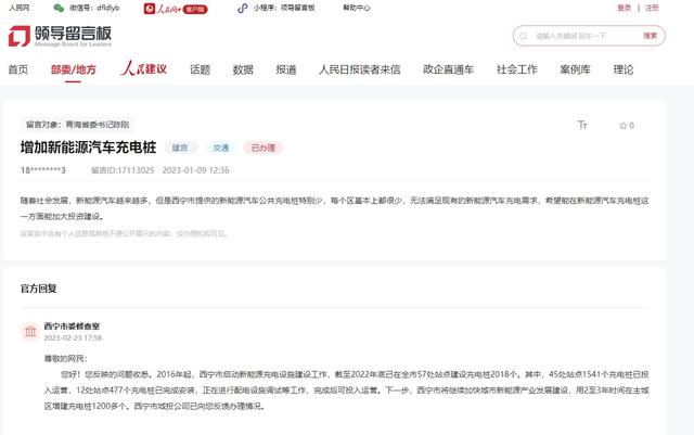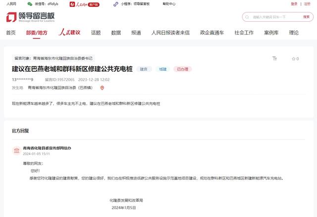 “建議在海(hai)東市化(hua)隆縣(xian)巴(ba)燕老城和群(qun)(qun)科新(xin)區(qu)(qu)修(xiu)建公共充電樁。”“西寧市區(qu)(qu)可提(ti)供的(de)新(xin)能(neng)源(yuan)(yuan)汽車公共充電樁太少(shao)了。”“西寧市往返(fan)澤庫縣(xian),新(xin)能(neng)源(yuan)(yuan)汽車充電麻煩。”……自2023年起,青海(hai)省各地群(qun)(qun)眾通過人民(min)網“領導(dao)留言板”反映“充電樁少(shao)”的(de)問題(ti)有了回音。