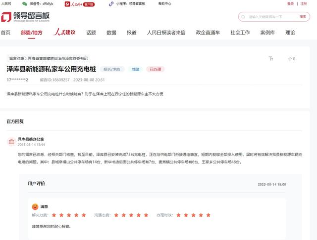 “黃南州澤庫(ku)縣新(xin)(xin)能源私家車(che)(che)公用充(chong)電(dian)(dian)樁什么(me)時(shi)候能有(you)(you)?澤庫(ku)往返西寧(ning)(ning)路途(tu)遙遠,對(dui)新(xin)(xin)能源車(che)(che)主不太方便。”家住(zhu)西寧(ning)(ning)市工作在(zai)澤庫(ku)縣的群(qun)眾留言稱(cheng)。對(dui)此,澤庫(ku)縣委辦公室回復稱(cheng),“經(jing)相關部門(men)核查,截至(zhi)目(mu)前(qian),澤庫(ku)縣已安裝完(wan)成73臺(tai)充(chong)電(dian)(dian)樁,正在(zai)與供電(dian)(dian)部門(men)銜接通(tong)電(dian)(dian)事宜,短期內能夠(gou)全部投入使用,屆時(shi)將有(you)(you)效解(jie)決澤庫(ku)縣新(xin)(xin)能源車(che)(che)輛充(chong)電(dian)(dian)難(nan)的問題。其(qi)中:縣城幸(xing)福山公共(gong)停(ting)車(che)(che)場(chang)有(you)(you)14臺(tai)、新(xin)(xin)華書店后面公共(gong)停(ting)車(che)(che)場(chang)有(you)(you)7臺(tai)、麥秀鎮公共(gong)停(ting)車(che)(che)場(chang)有(you)(you)6臺(tai)、王(wang)家鄉公共(gong)停(ting)車(che)(che)場(chang)46臺(tai)。”留言解(jie)決后,該群(qun)眾對(dui)官方回復打出五星滿意。