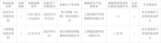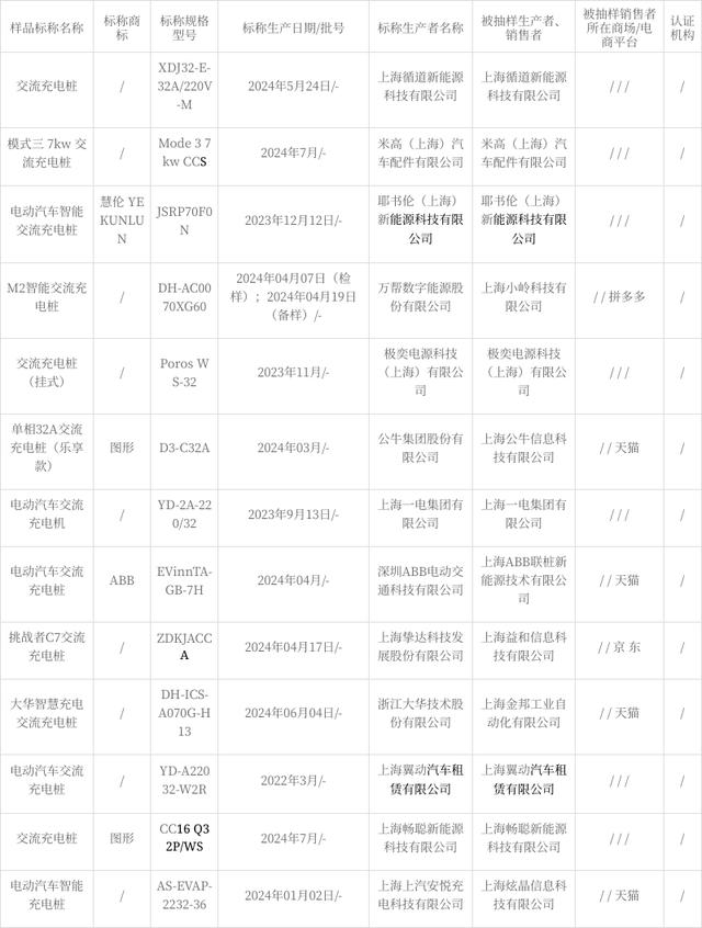 2024年上海市新能源汽車交流充電樁產品質量監督抽查不合格產品