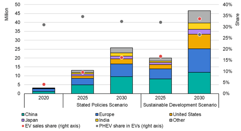 截止2020年底,全球已有超過1100萬輛電動汽車上路。雖然在疫情影響下全球汽車產業出現大幅衰退,但2020年全球電動汽車注冊量仍增長了41%。根據IEA(國際能源署)數據,預計2025年全球電動車銷量將有望達到1500-2000萬輛。