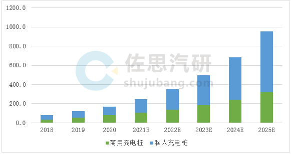 預計到2025年,我國新能源汽車保有量將達1782萬輛, 充電樁總量約為939.1萬個,其中私人充電樁618.3萬個,商用充電樁(含公共和專用)320.8萬個,總體樁車比 0.53:1。