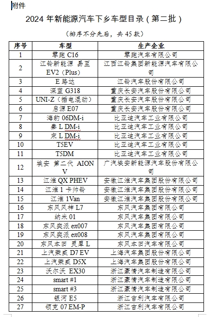 工業和信息化部辦公廳 國家發展改革委辦公廳 農業農村部辦公廳 商務部辦公廳 國家能源局綜合司關于發布2024年新能源汽車下鄉車型目錄(第二批)的通知