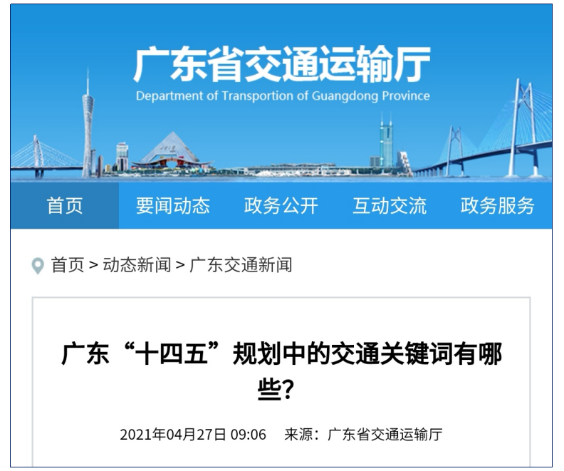 4月25日,《廣東省國民經濟和社會發展第十四個五年規劃和2035年遠景目標綱要》(下稱“規劃綱要”)正式發布。4月27日,廣東省交通運輸廳官網發文《廣東“十四五”規劃中的交通關鍵詞有哪些?》。摘要如下: