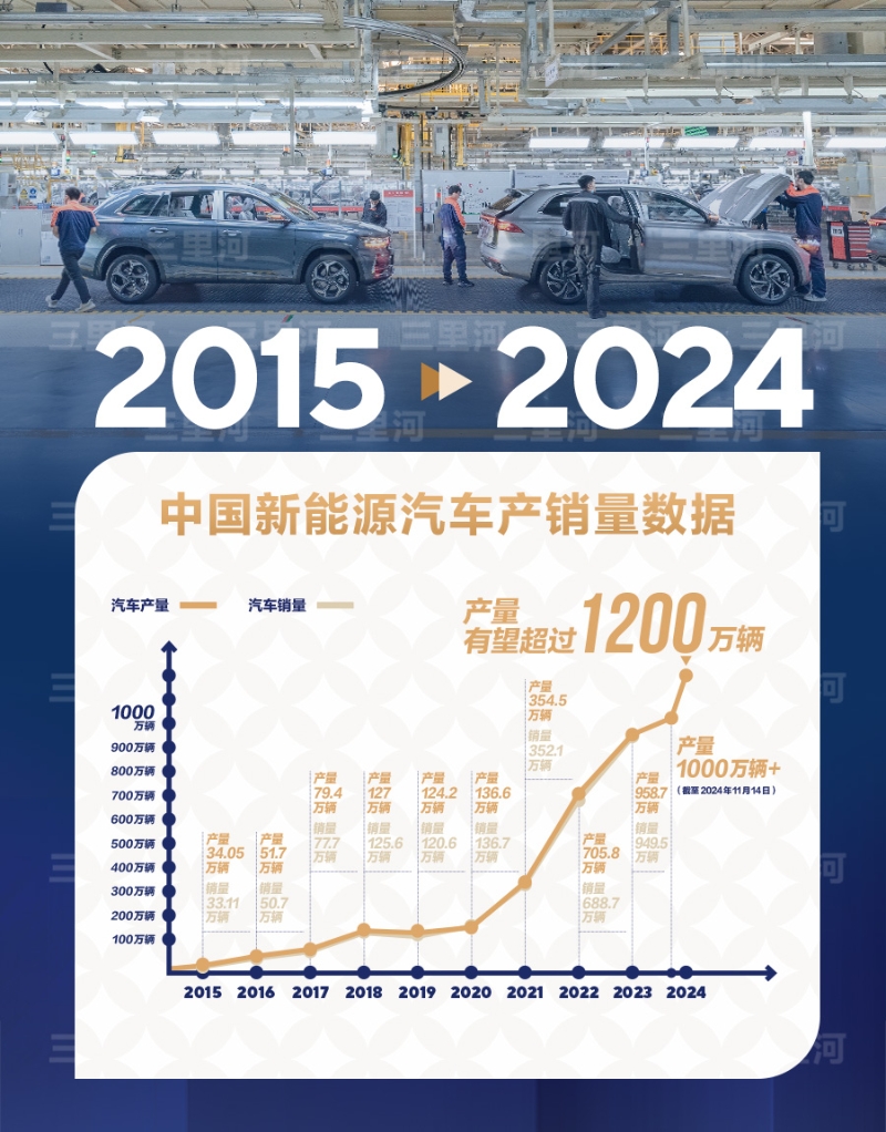 從(cong)2009年的“十(shi)城千(qian)輛(liang)(liang)”規(gui)模推廣起步,到2018年年產銷量超(chao)百萬輛(liang)(liang),中國用了近10年時間;2022年年產銷量逾(yu)500萬輛(liang)(liang),用時約4年;2024年產量突破千(qian)萬輛(liang)(liang),僅(jin)約2年。