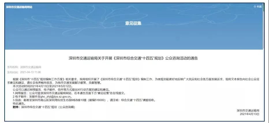2021年(nian)4月(yue)13日,深圳市交通運輸局發布(bu)關于開展(zhan)《深圳市綜合交通“十(shi)四五(wu)”規劃》公(gong)(gong)眾咨詢活動的通告。本次活動時間2021年(nian)4月(yue)13日至2021年(nian)5月(yue)12日。公(gong)(gong)眾可以通過網絡(luo)留言、電(dian)子郵件(jian)、信件(jian)等方式提出對(dui)行動方案(an)的建議和(he)意見。