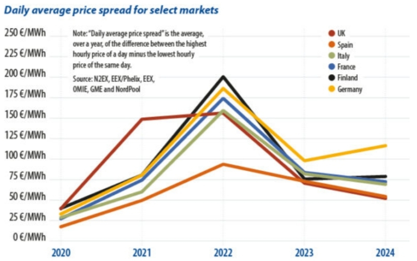 ??自從2022年以來,批發價(jia)格波動(dong)(dong)性有(you)所下(xia)降,但沒有(you)回(hui)到之(zhi)前的水平,現在又再次上升。此次批發價(jia)格波動(dong)(dong)是由一(yi)些更加(jia)持久性因(yin)素驅動(dong)(dong):開發更多(duo)的可再生能(neng)源發電(dian)設(she)施(shi),尤其是太陽能(neng)發電(dian)設(she)施(shi)。