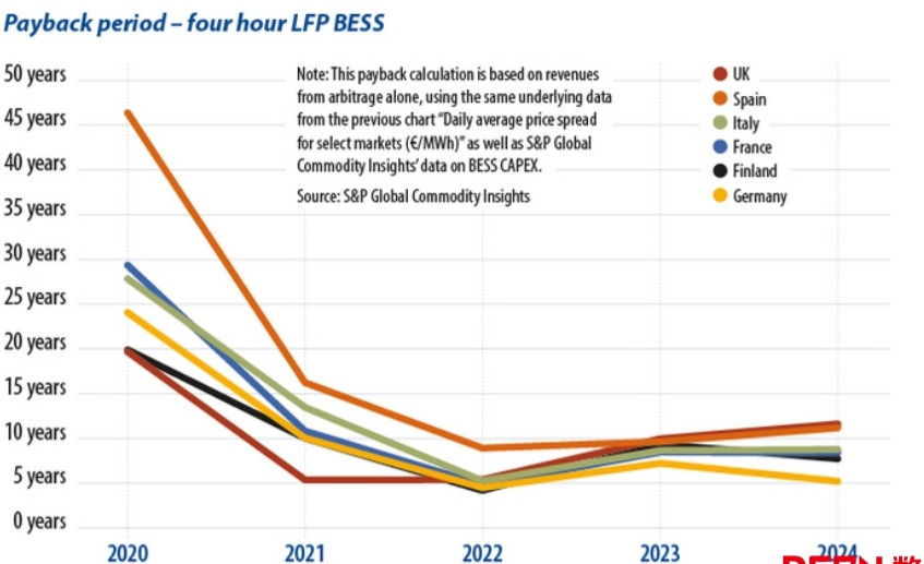 圖(tu)1 持(chi)續時(shi)間(jian)(jian)為4小時(shi)電池儲能系統的投(tou)資回報(bao)時(shi)間(jian)(jian)快速下降(jiang)