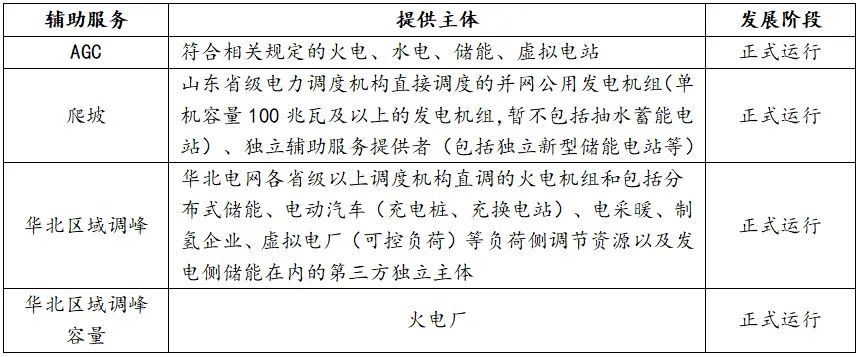 山東輔助服(fu)(fu)務(wu)市場(chang)(chang)(chang)包括(kuo)AGC和爬坡等內容(rong)。其中爬坡市場(chang)(chang)(chang)為山東獨有的輔助服(fu)(fu)務(wu)市場(chang)(chang)(chang)。山東隸屬(shu)于華北電網,故(gu)山東電力(li)市場(chang)(chang)(chang)相關主體(ti)還可通過(guo)華北區域調峰和華北區域調峰容(rong)量(liang)市場(chang)(chang)(chang)獲利(li)。山東電力(li)輔助服(fu)(fu)務(wu)市場(chang)(chang)(chang)的類型,提供主體(ti)和發展階段情(qing)況如下表(biao)所示: