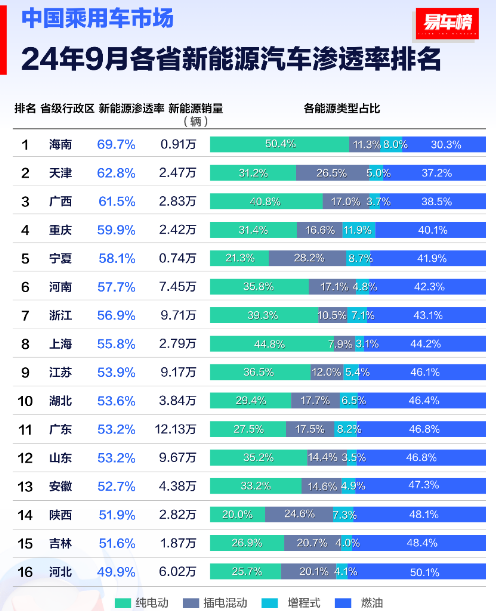 根據汽車(che)平臺易車(che)整理的終(zhong)端銷量(liang)數據(不包含(han)進口車(che))顯(xian)示: 9月省(sheng)級行政區(qu)新能源滲透(tou)率前3名分別為:海南省(sheng)、天(tian)津市、廣西壯族自(zi)治區(qu),穩(wen)居第二名的天(tian)津市新能源滲透(tou)率已達到62.8%。