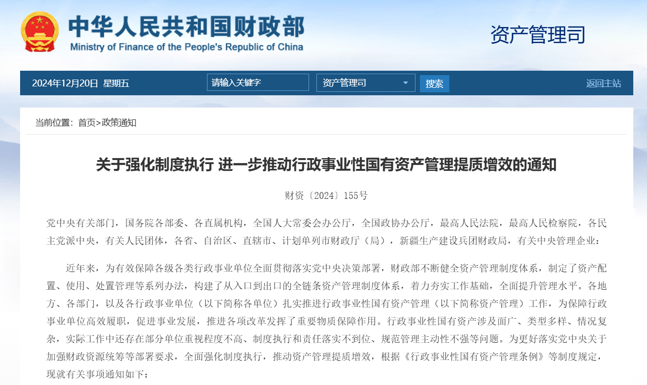 近年來,為(wei)有效保障(zhang)各(ge)級(ji)各(ge)類(lei)行(xing)(xing)(xing)政(zheng)事(shi)(shi)(shi)(shi)業(ye)單(dan)位(wei)全(quan)面(mian)貫徹落(luo)(luo)實(shi)(shi)黨(dang)中央決策部(bu)署(shu),財(cai)政(zheng)部(bu)不斷(duan)健全(quan)資(zi)(zi)(zi)產(chan)(chan)(chan)管(guan)(guan)理(li)制(zhi)度體(ti)系(xi),制(zhi)定了(le)資(zi)(zi)(zi)產(chan)(chan)(chan)配(pei)置(zhi)、使用(yong)、處置(zhi)管(guan)(guan)理(li)等系(xi)列辦法(fa),構建了(le)從入口到(dao)出口的全(quan)鏈(lian)條(tiao)資(zi)(zi)(zi)產(chan)(chan)(chan)管(guan)(guan)理(li)制(zhi)度體(ti)系(xi),著力夯實(shi)(shi)工(gong)作(zuo)基(ji)礎(chu),全(quan)面(mian)提升管(guan)(guan)理(li)水平。各(ge)地(di)方、各(ge)部(bu)門,以(yi)及(ji)各(ge)行(xing)(xing)(xing)政(zheng)事(shi)(shi)(shi)(shi)業(ye)單(dan)位(wei)(以(yi)下簡稱各(ge)單(dan)位(wei))扎(zha)實(shi)(shi)推進行(xing)(xing)(xing)政(zheng)事(shi)(shi)(shi)(shi)業(ye)性國(guo)有資(zi)(zi)(zi)產(chan)(chan)(chan)管(guan)(guan)理(li)(以(yi)下簡稱資(zi)(zi)(zi)產(chan)(chan)(chan)管(guan)(guan)理(li))工(gong)作(zuo),為(wei)保障(zhang)行(xing)(xing)(xing)政(zheng)事(shi)(shi)(shi)(shi)業(ye)單(dan)位(wei)高(gao)效履職(zhi),促進事(shi)(shi)(shi)(shi)業(ye)發(fa)展(zhan),推進各(ge)項(xiang)改革發(fa)揮了(le)重(zhong)要(yao)(yao)物質保障(zhang)作(zuo)用(yong)。行(xing)(xing)(xing)政(zheng)事(shi)(shi)(shi)(shi)業(ye)性國(guo)有資(zi)(zi)(zi)產(chan)(chan)(chan)涉及(ji)面(mian)廣、類(lei)型(xing)多(duo)樣、情況復雜,實(shi)(shi)際(ji)工(gong)作(zuo)中還存在部(bu)分單(dan)位(wei)重(zhong)視程(cheng)度不高(gao)、制(zhi)度執(zhi)(zhi)行(xing)(xing)(xing)和責(ze)任落(luo)(luo)實(shi)(shi)不到(dao)位(wei)、規范(fan)管(guan)(guan)理(li)主動性不強等問題。為(wei)更好落(luo)(luo)實(shi)(shi)黨(dang)中央關(guan)于(yu)加(jia)強財(cai)政(zheng)資(zi)(zi)(zi)源統籌等部(bu)署(shu)要(yao)(yao)求(qiu),全(quan)面(mian)強化制(zhi)度執(zhi)(zhi)行(xing)(xing)(xing),推動資(zi)(zi)(zi)產(chan)(chan)(chan)管(guan)(guan)理(li)提質增效,根據《行(xing)(xing)(xing)政(zheng)事(shi)(shi)(shi)(shi)業(ye)性國(guo)有資(zi)(zi)(zi)產(chan)(chan)(chan)管(guan)(guan)理(li)條(tiao)例》等制(zhi)度規定,現就有關(guan)事(shi)(shi)(shi)(shi)項(xiang)通知如下: