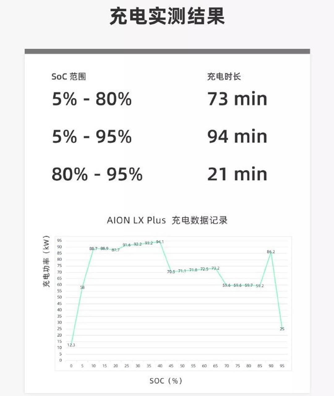 按照正常動(dong)力電(dian)(dian)池企業和汽(qi)車品牌對電(dian)(dian)池的管(guan)理方式(shi)和優化方式(shi),很多品牌的電(dian)(dian)動(dong)車電(dian)(dian)池進入到(dao)(dao)80%甚至(zhi)90%才會(hui)進入到(dao)(dao)涓(juan)流充電(dian)(dian),為了(le)保(bao)護電(dian)(dian)池的發熱和電(dian)(dian)池壽命;而廣汽(qi)集團(tuan)的電(dian)(dian)池在45%時充電(dian)(dian)功(gong)率就暴跌(die)到(dao)(dao)70kW,后來(lai)到(dao)(dao)了(le)60%時功(gong)率更是(shi)跌(die)倒了(le)60kW,最后不(bu)(bu)知為何又(you)上(shang)升(sheng)到(dao)(dao)了(le)86kW后迅(xun)速下(xia)跌(die),驚不(bu)(bu)驚喜(xi)?意(yi)不(bu)(bu)意(yi)外(wai)?
