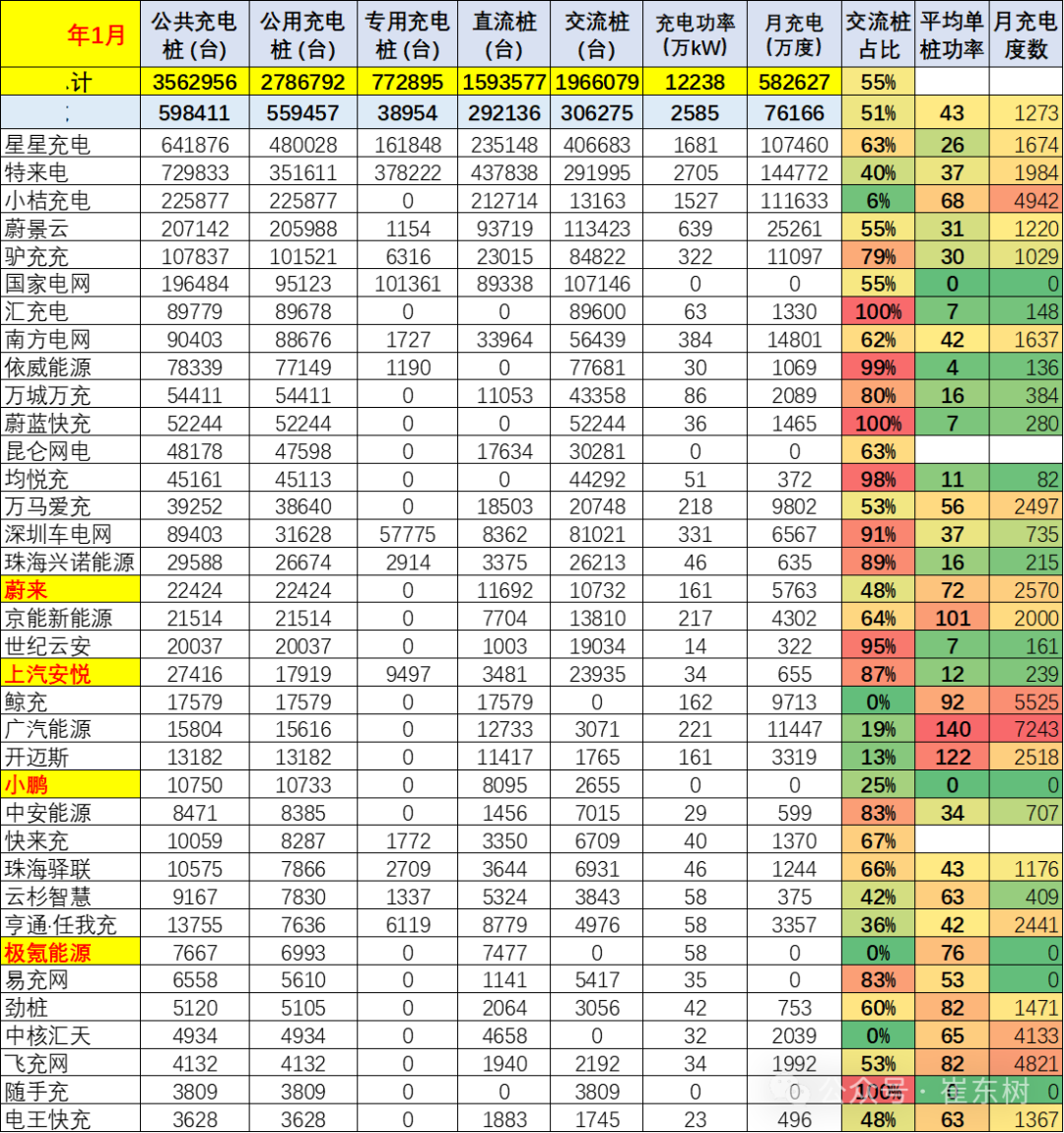 目前的直流充電樁的發展規模較大,頭部的運營商表現較強。廣汽能源的充電樁1月平均充電達到7243度,每月都表現很好。蔚來的充電樁充電量達到2570度左右。前期特斯拉達到3634度,都表現很好。而部分老舊充電樁的充電平均僅有月均100多度,主力充電企業的月均充電在千度水平,充電電量差距幾倍到幾十倍的效益差距極其巨大。特斯拉各月數據保持穩定,數據很不錯。。部分著眼未來新能源汽車特別是電動汽車快速增長的趨勢,需要進一步構建高質量充電基礎設施體系,更新老舊交流低功率樁,增加高功率直流快充的升級,更好滿足人民群眾購置和使用新能源汽車需要,助力推進交通運輸綠色低碳轉型與現代化基礎設施體系建設。