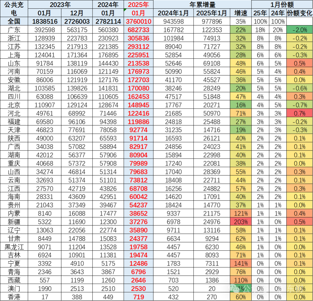 2025年1月廣東的公共充電樁數量增長12萬個,充電樁份額也達到了18%,去年1月增量17萬個,份額達到20%,今年份額有所下降。