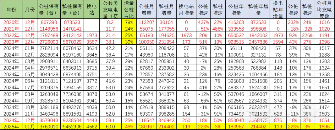 2025年1月的公樁總量達到376萬個,1月公樁數量較上月增長18萬個,快于去年同期223%。隨車私樁目前有945萬個,1月較上月增長21.4萬個,增速3%;1月公樁單樁月均充電1596度,較去年1月1517度增長較好。