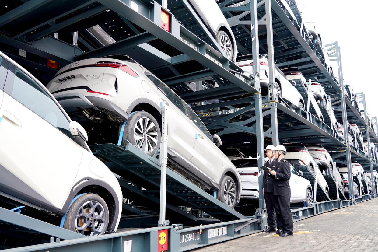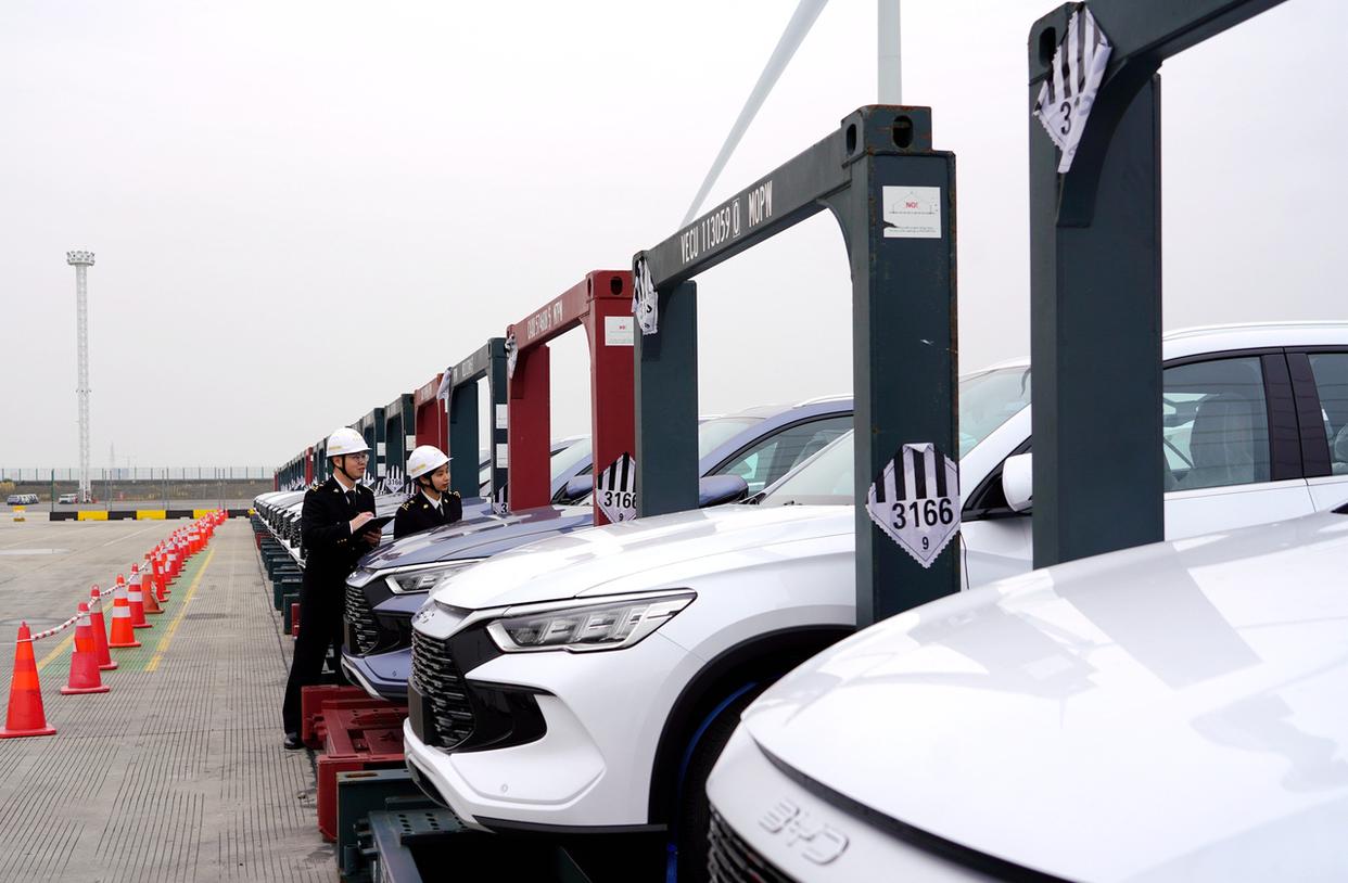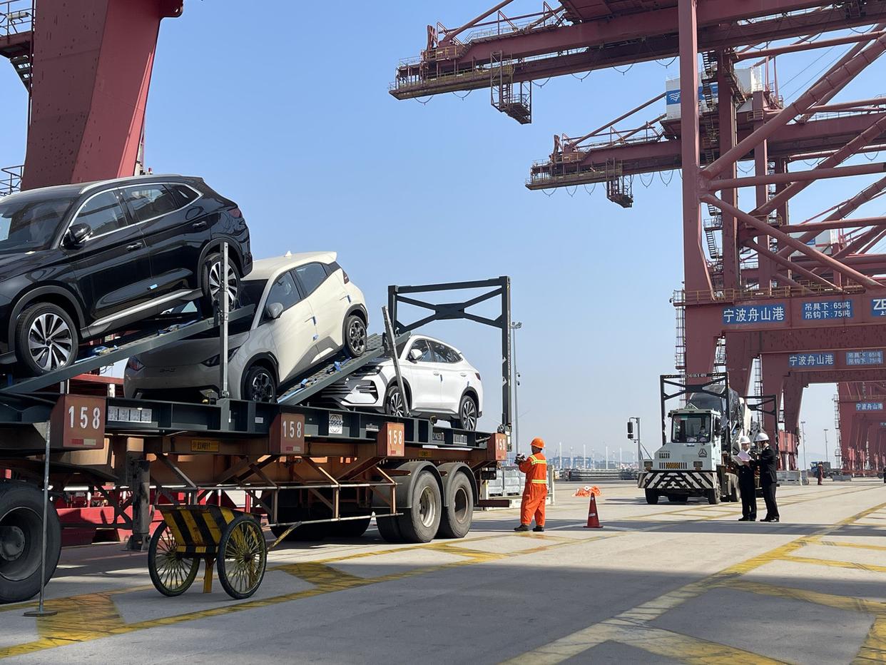 3月23日,寧波舟山港梅山港區2號泊位,在寧波海關所屬梅山海關關員的監管下,裝有比亞迪新能源汽車的框架箱被吊裝上集裝箱船“伊塔波阿”輪,共計2787輛新能源汽車即將出海。