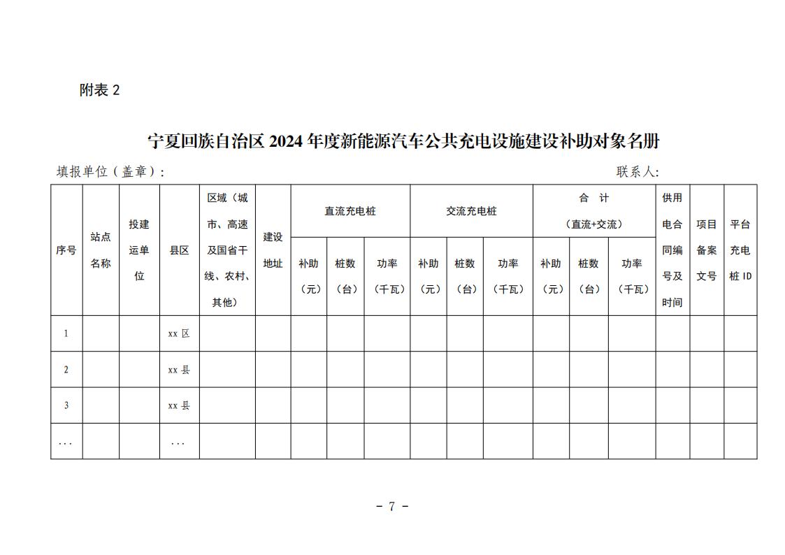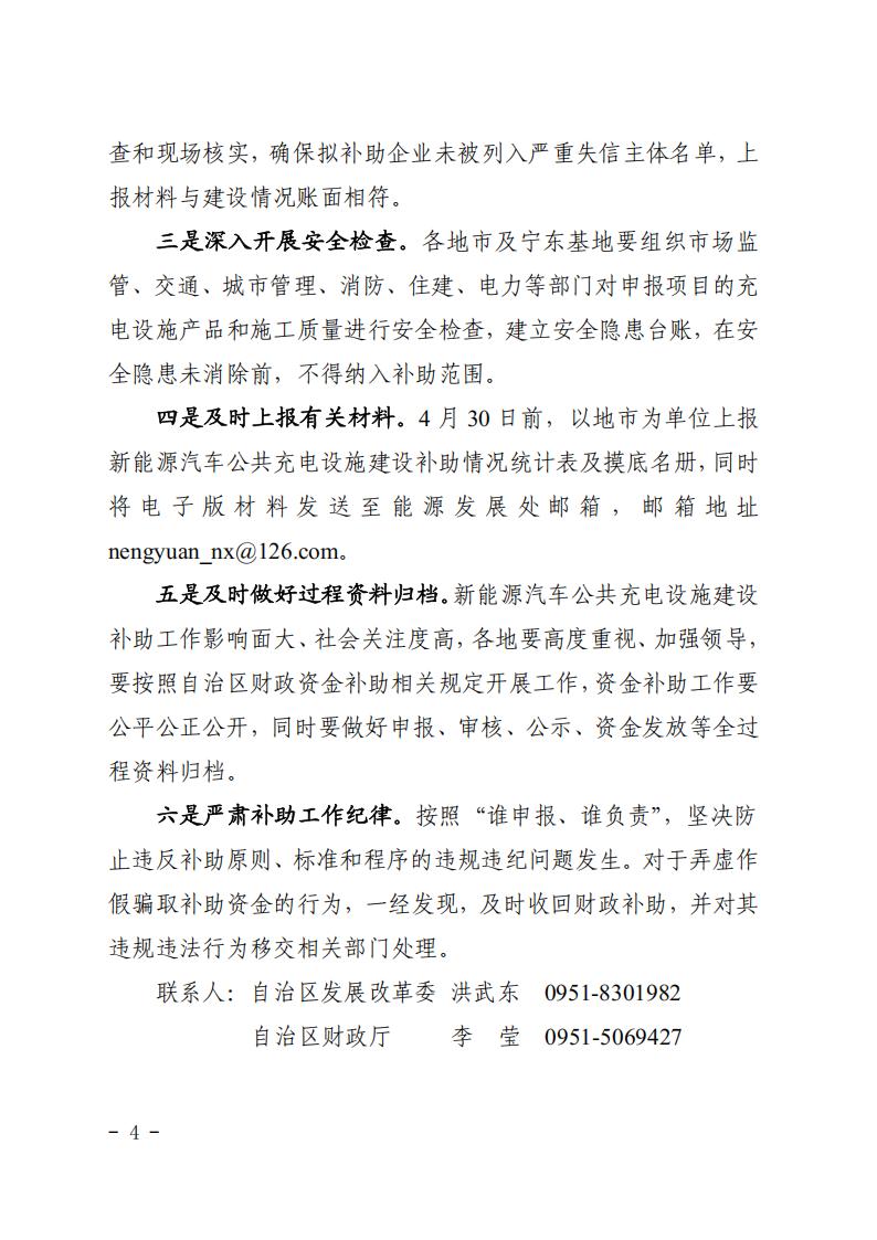 四是及時上報有關材料。4月30日前,以地市為單位上報新能源汽車公共充電設施建設補助情況統計表及摸底名冊,同時將電子版材料發送至能源發展處郵箱,郵箱地址nengyuan_nx@126.com。