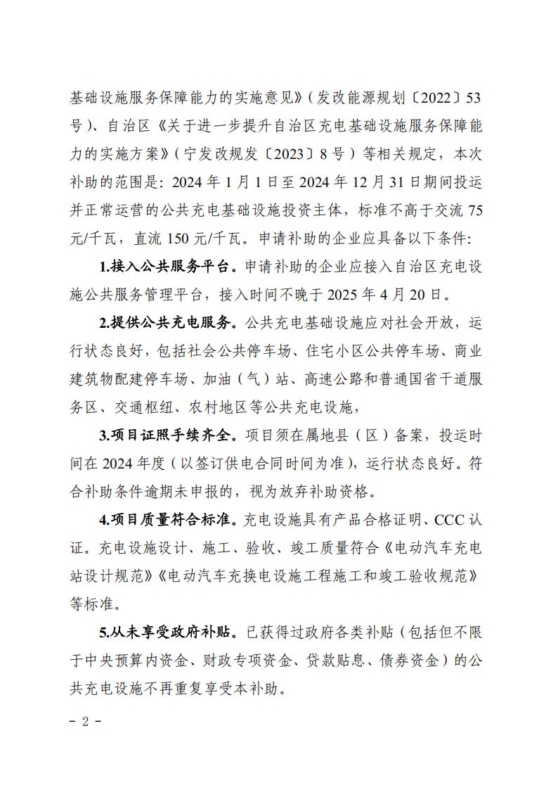 根據《國家發展改革委等部門關于進一步提升電動汽車充電基礎設施服務保障能力的實施意見》(發改能源規劃〔2022〕53號)、自治區《關于進一步提升自治區充電基礎設施服務保障能力的實施方案》(寧發改規發〔2023〕8號)等相關規定,本次補助的范圍是:2024年1月1日至2024年12月31日期間投運并正常運營的公共充電基礎設施投資主體,標準不高于交流75元/千瓦,直流150元/千瓦。申請補助的企業應具備以下條件: