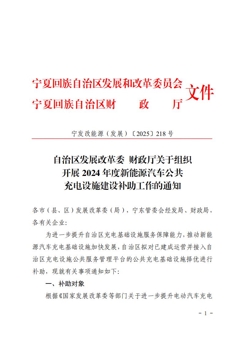 3月25日,寧夏自治區發展改革委 財政廳關于組織開展2024年度新能源汽車公共充電設施建設補助工作的通知(寧發改能源(發展)[2025]218號)