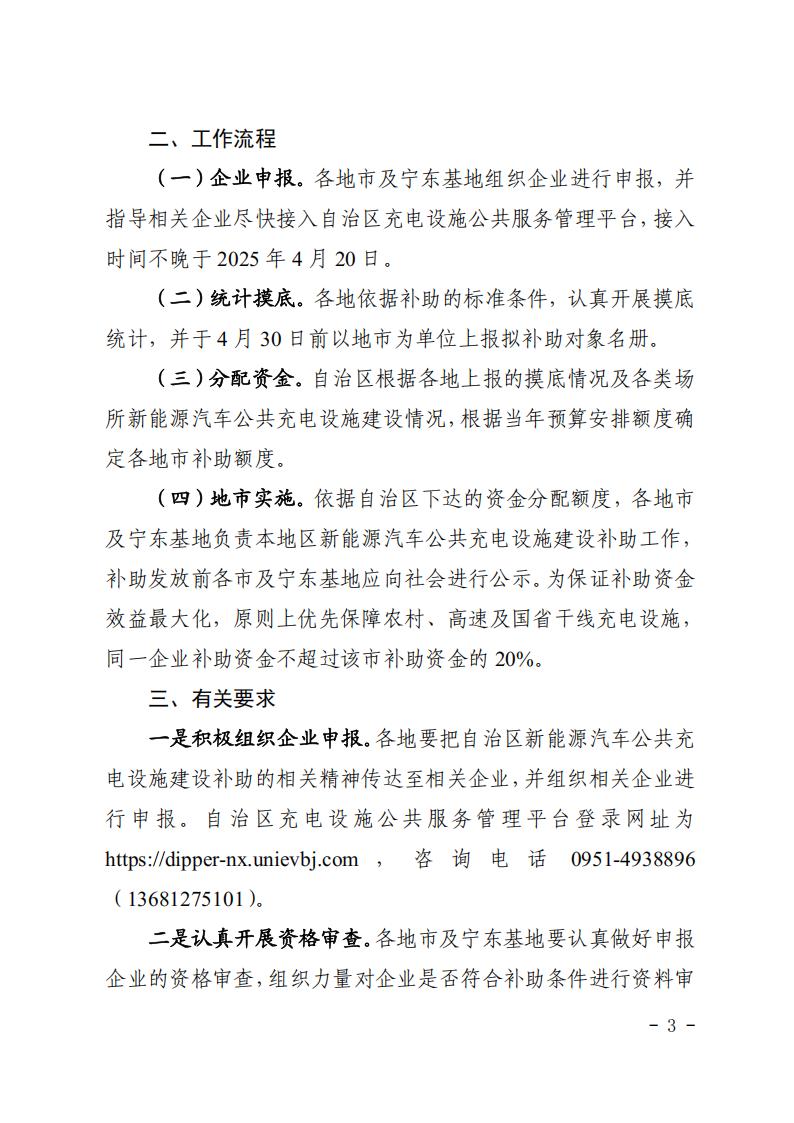 (一)企業申報。各地市及寧東基地組織企業進行申報,并指導相關企業盡快接入自治區充電設施公共服務管理平臺,接入時間不晚于2025年4月20日。