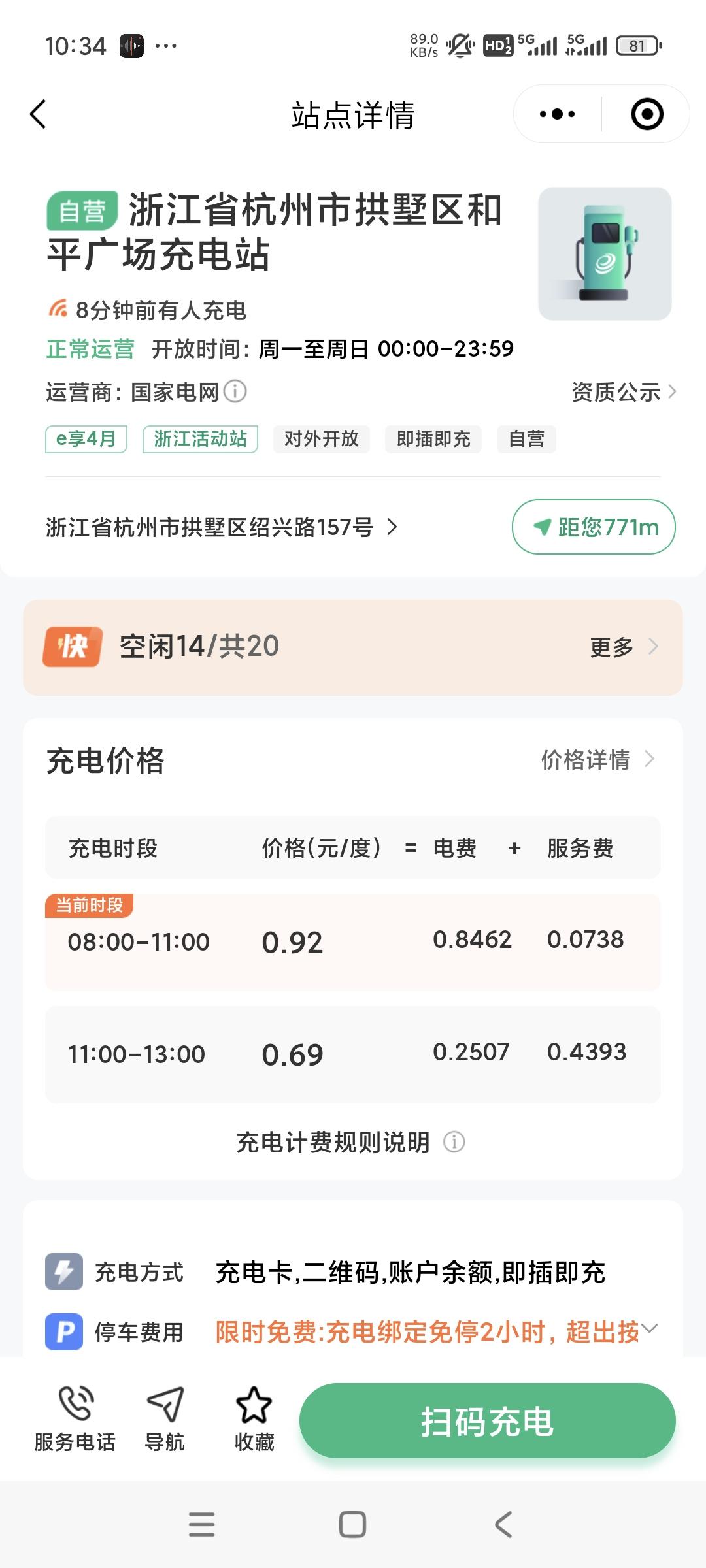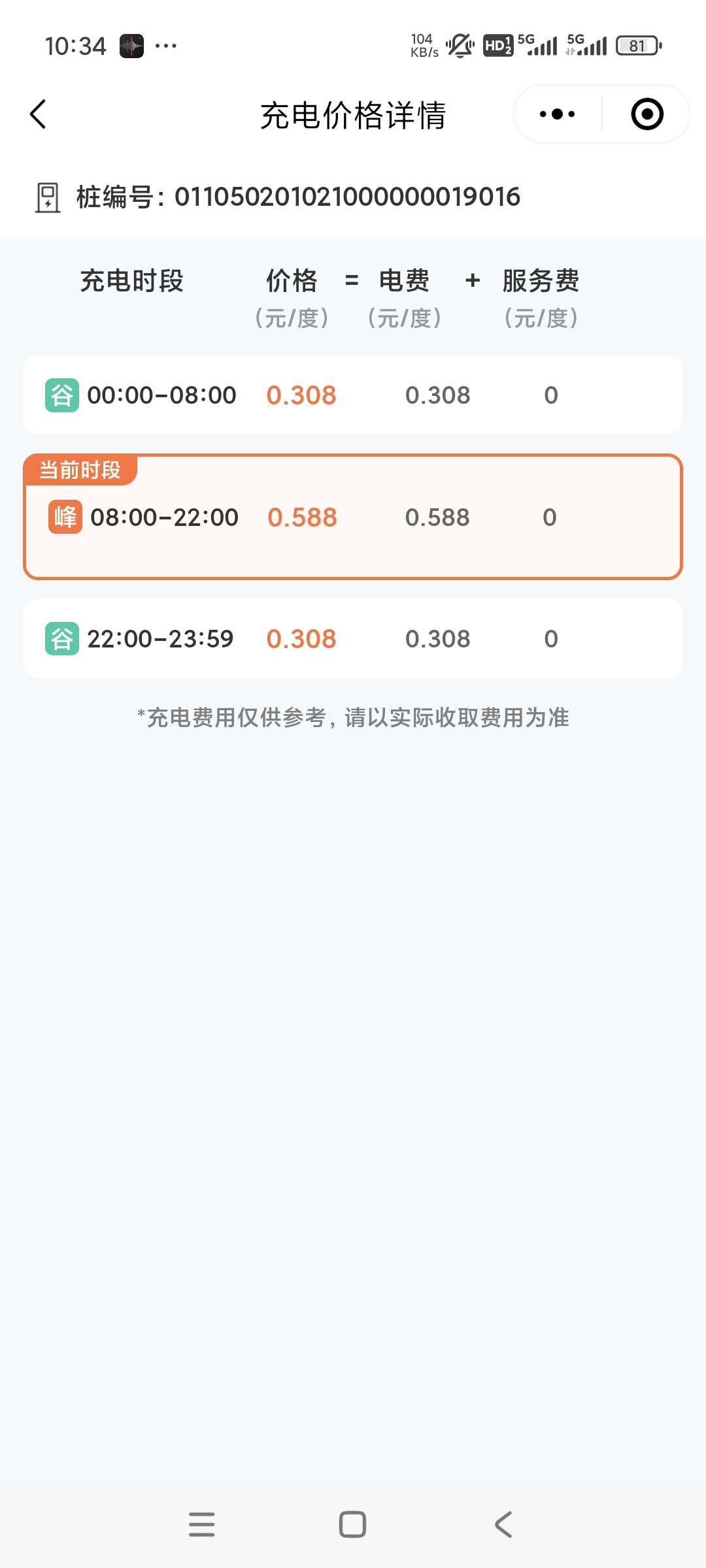 通過掃碼可以進入充電小程序,根據價格詳情,8時至22時每度電0.588元,22時至次日8時每度電0.308元,和居民峰谷電基本一致,且不收取服務費。