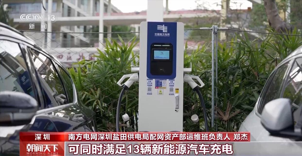 南方電網深圳鹽田供電局配網資產部運維班負責人 鄭杰:園區內還配備快充、慢充、V2G(汽車對電網)等充電樁,可同時滿足13輛新能源汽車充電。(央視財經)