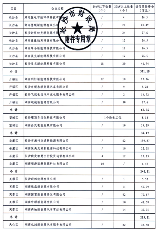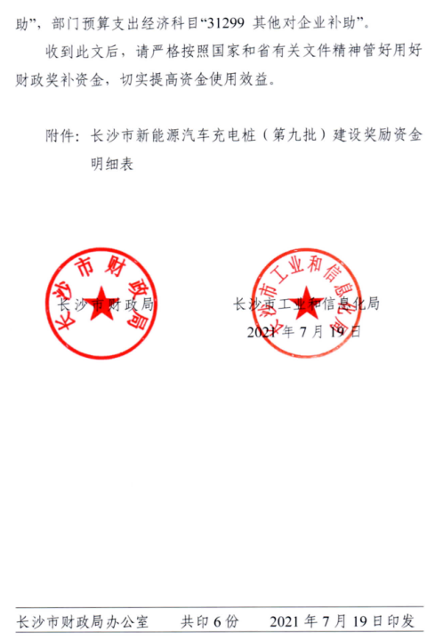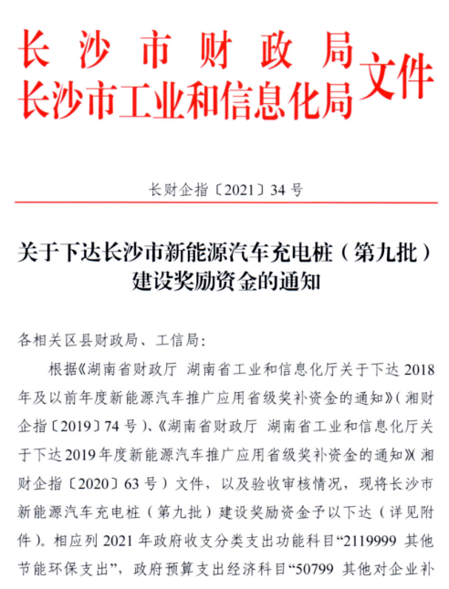 2021年7月19日,長(chang)(chang)沙市新能源汽車充(chong)電樁(第九批)建設(she)獎勵基金由長(chang)(chang)沙市財政局(ju)、長(chang)(chang)沙市工(gong)業和信息化局(ju)以“長(chang)(chang)財企指〔2021〕34號”文正式下達(da)。