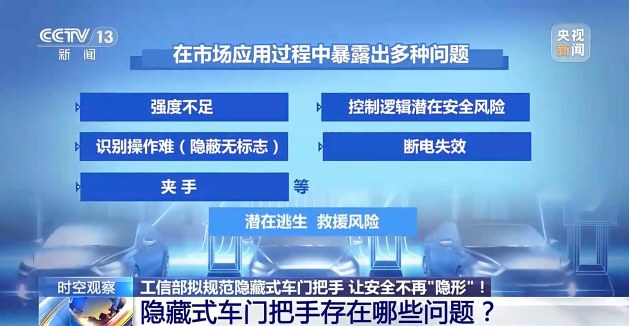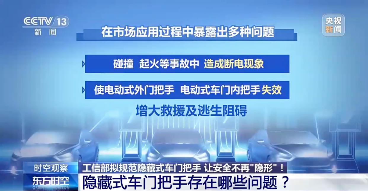 針對隱藏式車門把手在實際應用過程中暴露出來的一些問題,目前工業和信息化部已公開征集對《汽車車門把手安全技術要求》強制性國家標準制修訂計劃項目的意見。未來有關部門將通過相應《安全技術要求》規范汽車隱藏式門把手設計標準。(央視新聞)