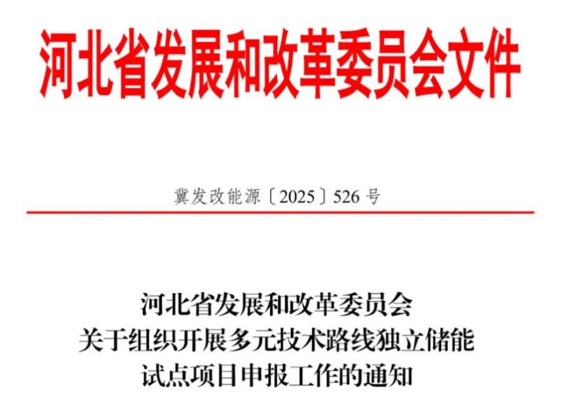 近日,河北省發改委發布《河北省發展和改革委員會關于組織開展多元技術路線獨立儲能試點項目申報工作的通知》(冀發改能源〔2025〕526號),擬安排項目總規模不超過3.5GW,各市推薦試點項目數量不超過5個。