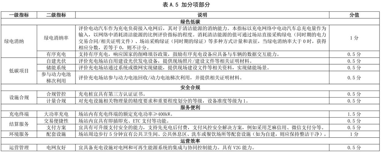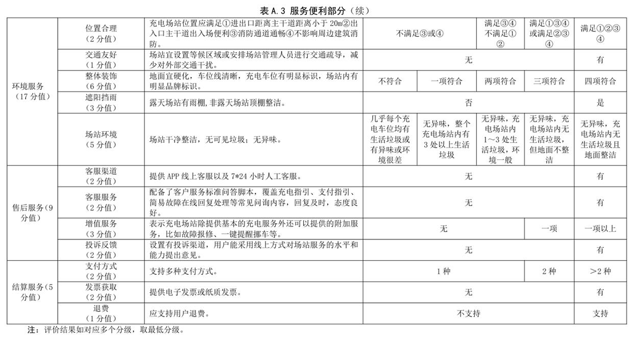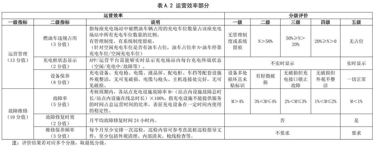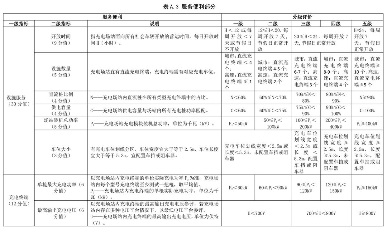 查詢《電動汽車充電設施及場站測試評價規范》獲悉,充電場站服務能力評價指標按照運營效率、服務便利程度、綠色低碳等方面進行綜合評級: