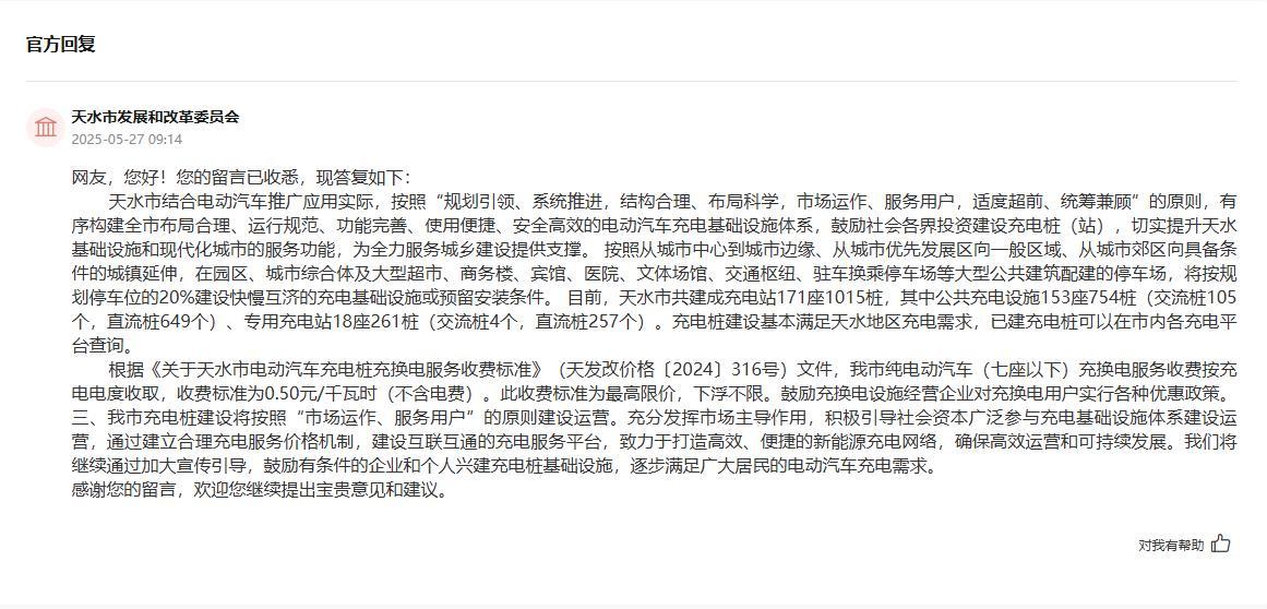 近日,甘肅多地網友通過人民網“領導留言板”咨詢充電樁建設的相關規劃,并建議多安裝充電設施,網友的留言均得到了當地相關部門的積極回應。