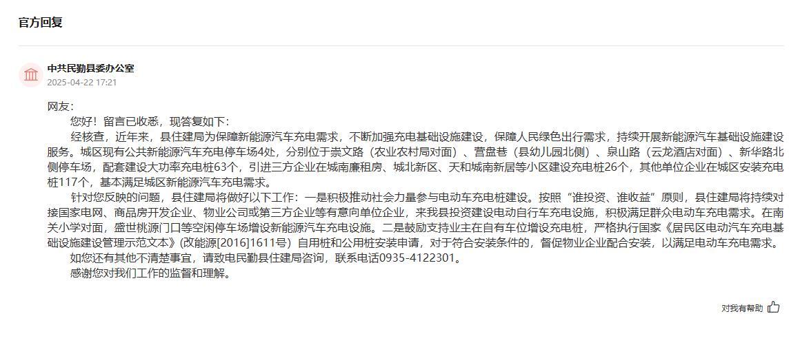 針對甘肅省武威市民勤縣網友提出的“充電樁較少”的問題,中共民勤縣委辦公室作出了回應:“經核查,近年來,縣住建局為保障新能源汽車充電需求,不斷加強充電基礎設施建設,保障群眾綠色出行需求,持續開展新能源汽車基礎設施建設服務。城區現有公共新能源汽車充電停車場4處,分別位于崇文路(農業農村局對面)、營盤巷(縣幼兒園北側)、泉山路(云龍酒店對面)、新華路北側停車場,配套建設大功率充電樁63個,引進三方企業在城南廉租房、城北新區、天和城南新居等小區建設充電樁26個,其他單位企業在城區安裝充電樁117個,基本滿足城區新能源汽車充電需求。”