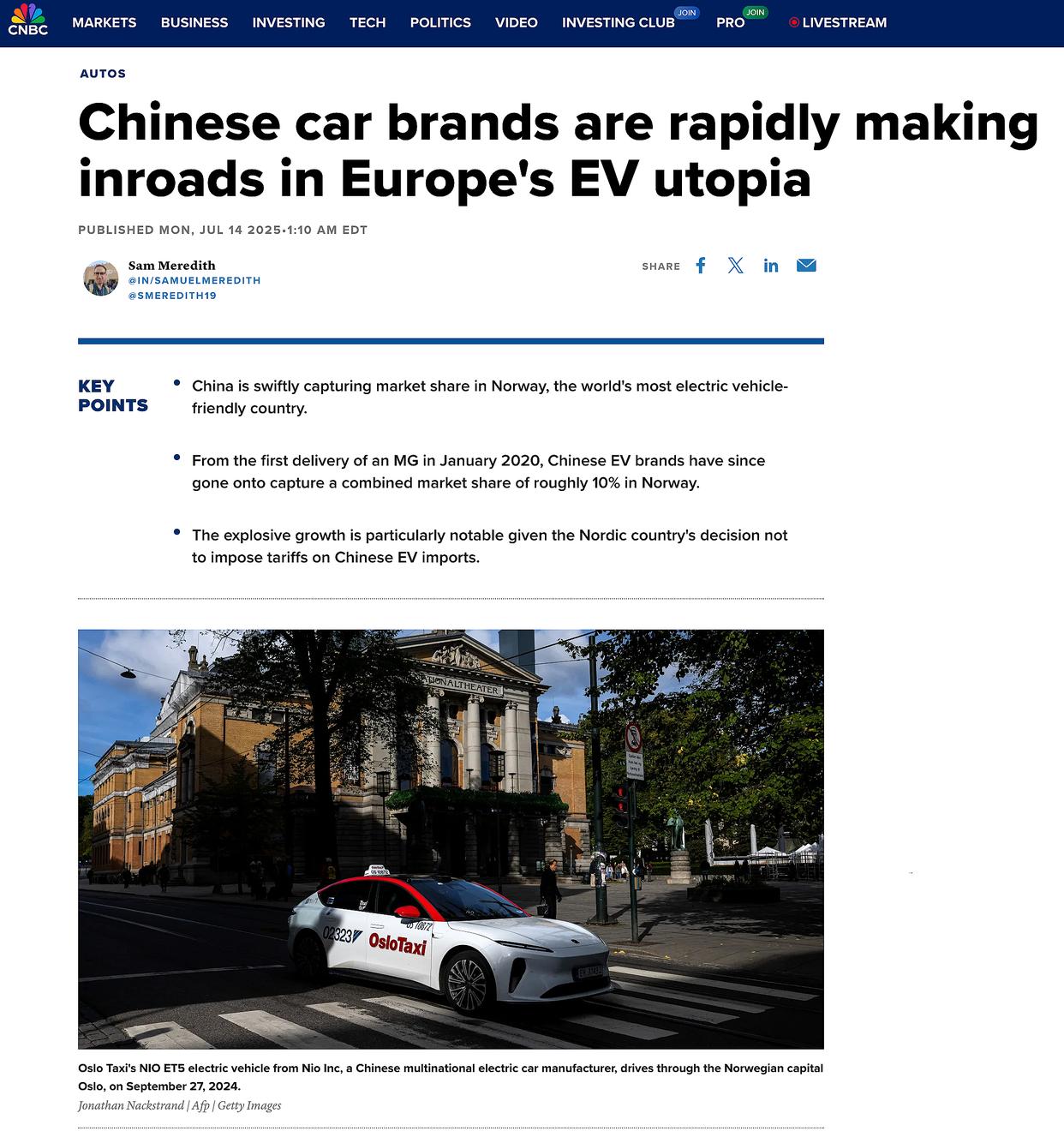 據美國消費者新聞與商業頻道(CNBC)當地時間7月14日報道,中國電動汽車品牌正在挪威迅速崛起,成為特斯拉及其他西方車企的有力競爭者。
