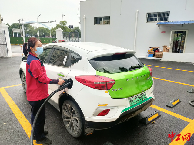 圖為(wei)工作(zuo)人(ren)員(yuan)正在使用集(ji)中式(shi)超充電裝置為(wei)電動(dong)車充電。
