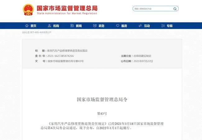 7月27日,新版《家(jia)用(yong)汽(qi)車產(chan)品修理更換(huan)退(tui)貨責任(ren)規(gui)定(ding)》(簡稱新版《汽(qi)車三(san)包(bao)規(gui)定(ding)》)正式公布,增加了多(duo)條涉及(ji)新能源汽(qi)車售后服務等(deng)內容。國家(jia)市場(chang)監督管理總局稱, 新規(gui)將(jiang)自2022年1月1日起(qi)施行,屆(jie)時現(xian)版《汽(qi)車三(san)包(bao)規(gui)定(ding)》將(jiang)同時廢(fei)止(zhi)。