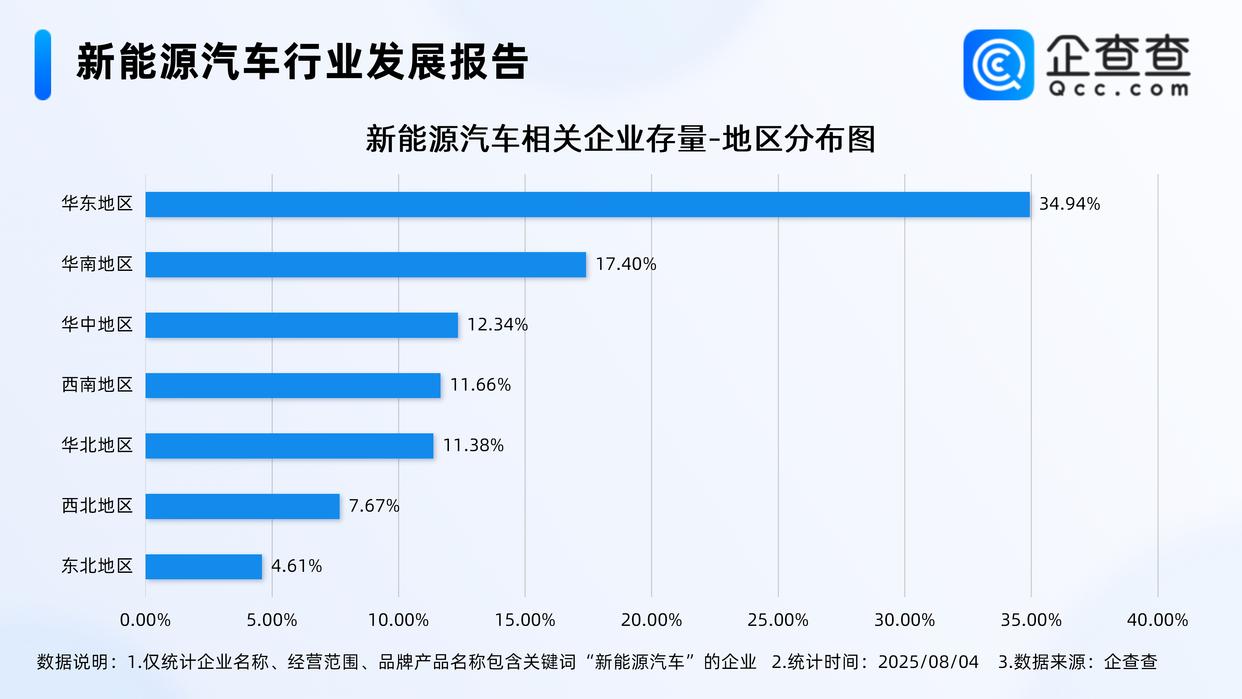 企查查數據顯示,從地區分布來看,分布在華東地區的新能源汽車相關企業最多,占比34.94%。其次,分布在華南地區、華中地區的相關企業分別占比17.40%、12.34%。