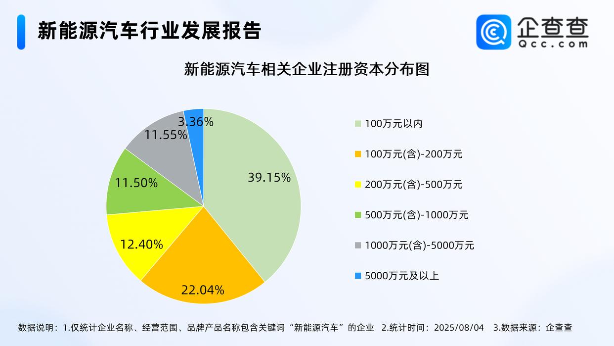 企查查數據顯示,從注冊資本來看,注冊資本在100萬元以內的新能源汽車相關現存企業最多,占比39.15%。其次,注冊資本在100萬元(含)-200萬元、200萬元(含)-500萬元的相關現存企業分別占比22.04%、12.40%。