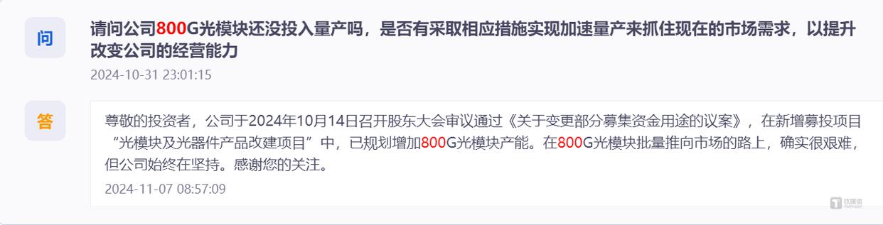 不过,光模块赛道巨头环伺(中际旭创、新易盛等),技术迭代(dai)快(kuai),量(liang)产爬坡难(nan)度极大。对于投资者急切询问800G光模块量(liang)产进展,铭普光磁的回应(ying)略显无奈:“在(zai)800G光模块批量(liang)推向市场(chang)的路上,确实很艰(jian)难(nan),但公司始终在(zai)坚持。”