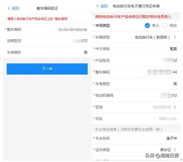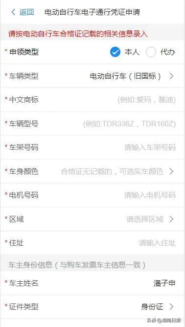 根據電(dian)動(dong)自行(xing)車(che)符合“新國標(biao)”還(huan)是“舊國標(biao)”,選擇相應入口進(jin)入申請頁(ye)面,填寫相關信(xin)息,上傳車(che)主身份(fen)證、購(gou)車(che)發票、電(dian)動(dong)自行(xing)車(che)產(chan)品(pin)合格證等材料原(yuan)件的(de)清晰照片,并(bing)提交申請。