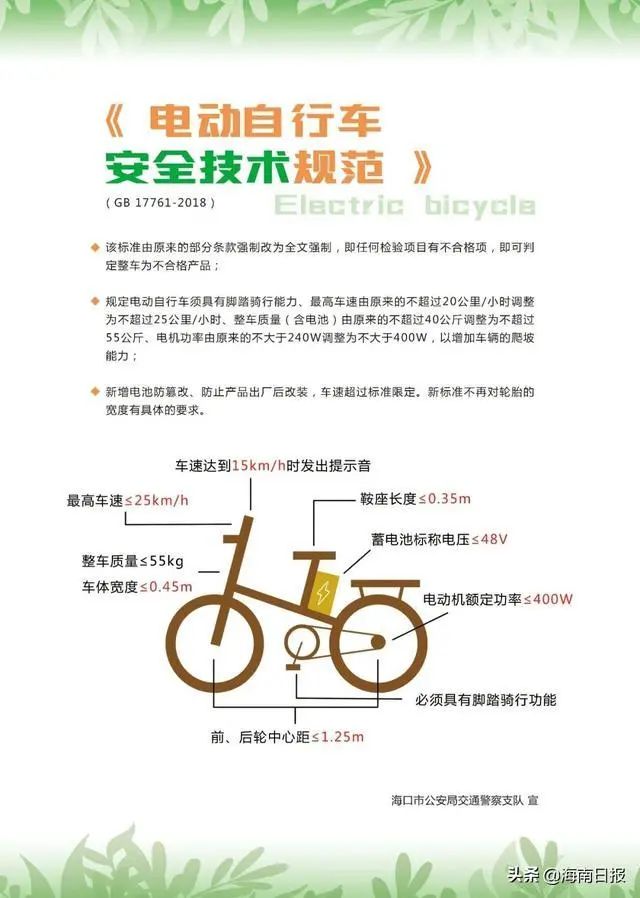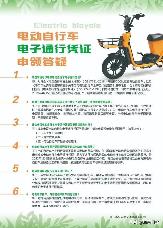 根據《海(hai)南省電(dian)動自(zi)行(xing)(xing)車(che)(che)管理(li)條(tiao)例》相關規定,海(hai)口市公安局交通(tong)警察支隊于(yu)2021年(nian)7月24日(ri)起對符(fu)合條(tiao)件的電(dian)動自(zi)行(xing)(xing)車(che)(che)實施(shi)電(dian)子通(tong)行(xing)(xing)憑證管理(li)。符(fu)合條(tiao)件的電(dian)動自(zi)行(xing)(xing)車(che)(che),可以申(shen)領電(dian)子通(tong)行(xing)(xing)憑證。2019年(nian)4月15日(ri)前已注(zhu)冊登記的電(dian)動自(zi)行(xing)(xing)車(che)(che),繼續懸掛原號(hao)牌行(xing)(xing)駛,不需要(yao)申(shen)領電(dian)子通(tong)行(xing)(xing)憑證。