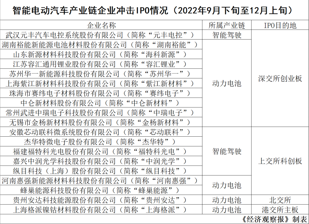 臨近年末,智能電動汽車行業迎來了一波沖擊IPO的小高潮。經濟觀察報記者不完全統計中國證監會IPO排隊名單以及香港聯交所公告看到,自9月20日至今,兩個多月內共有24家智能電動汽車產業鏈企業沖擊IPO(包括中途中止IPO進程的企業)。