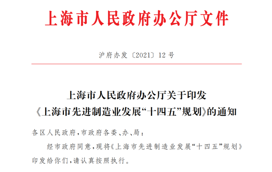 7月14日上海市人民政府辦公廳印發《上海市先進制造業發展“十四五”規劃》,發揮上海產業基礎和資源稟賦優勢,以集成電路、生物醫藥、人工智能三大先導產業為引領,大力發展電子信息、生命健康、汽車、高端裝備、先進材料、時尚消費品六大重點產業,構建“3+6”新型產業體系,打造具有國際競爭力的高端產業集群。
