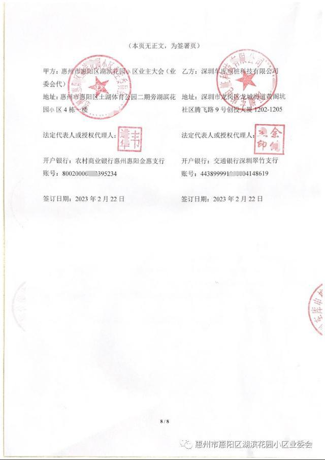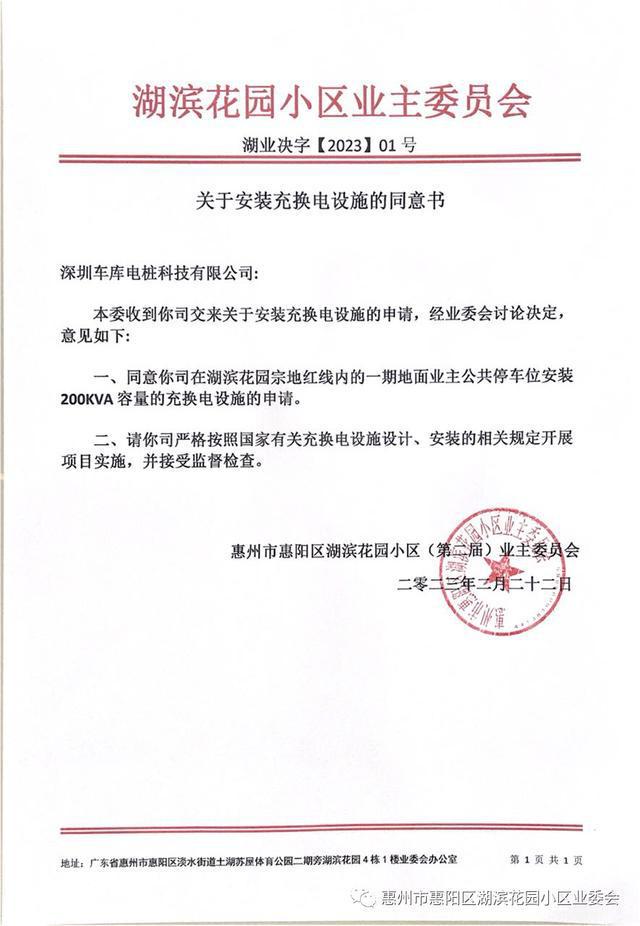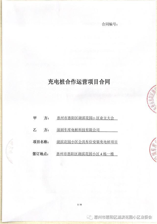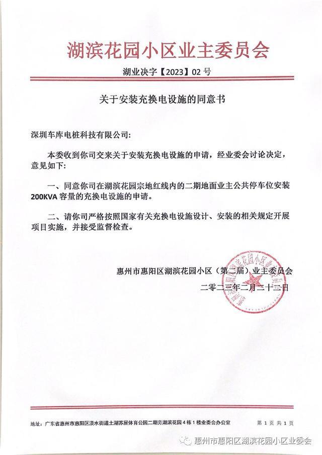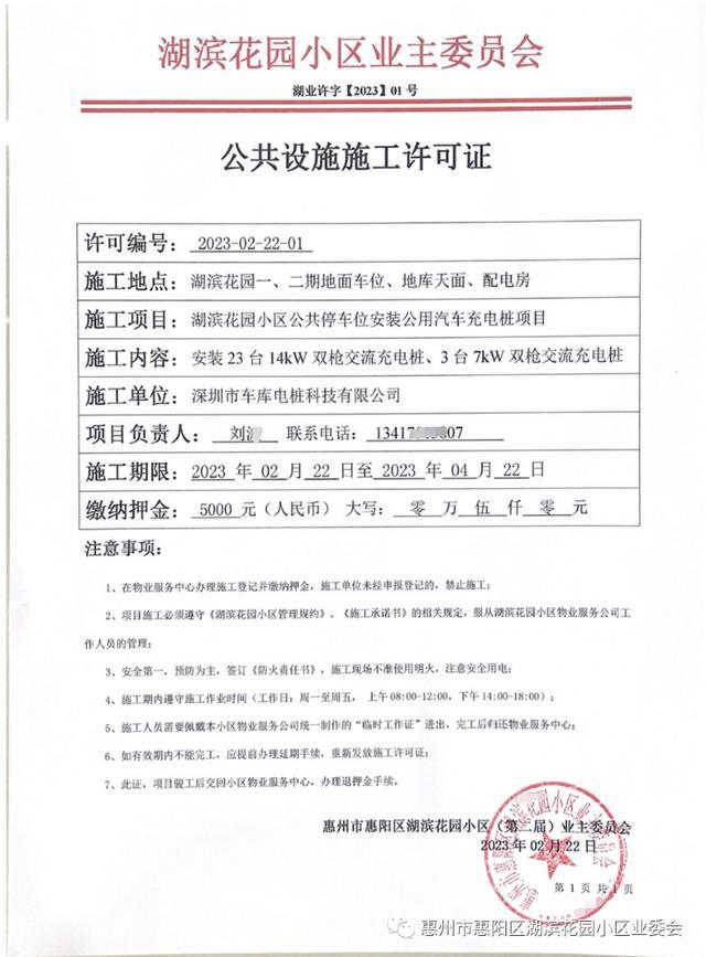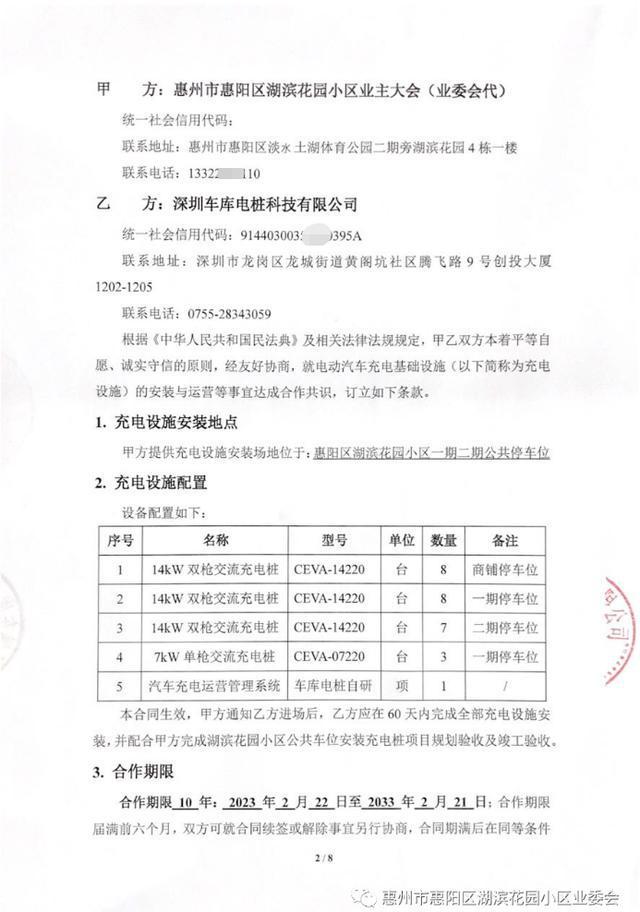 經過幾輪遴選2022年2月20日最終確定了合作的公司,今天,業委會依據《湖濱花園管理規約》第四十六條第5點的授權約定,代表“湖濱花園業主大會”簽訂了湖濱花園“充電樁合作運營項目合同”文件并向乙方建設單位開具《公共設施施工許可證》準許該公司進場。